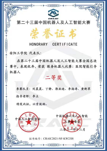 近日,由中国人工智能学会主办的第二十三届中国机器人及人工智能大赛全国总决赛结果公布,太阳成集团tyc33455cc李立老师指导的2019级员工刘晨晨等获得全国二等奖。